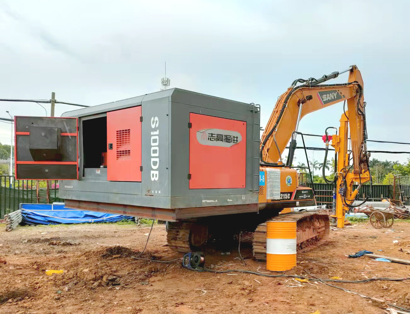 4、大功率空壓機(jī),既可以單獨(dú)放置接氣管;也可以安裝于挖機(jī)的配重位置,與挖機(jī)鉆機(jī)自成一體,使用更為方便快捷。